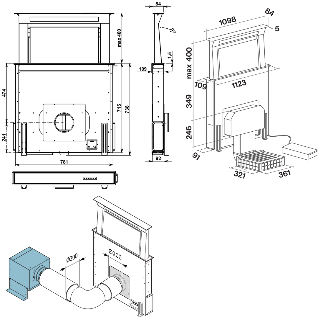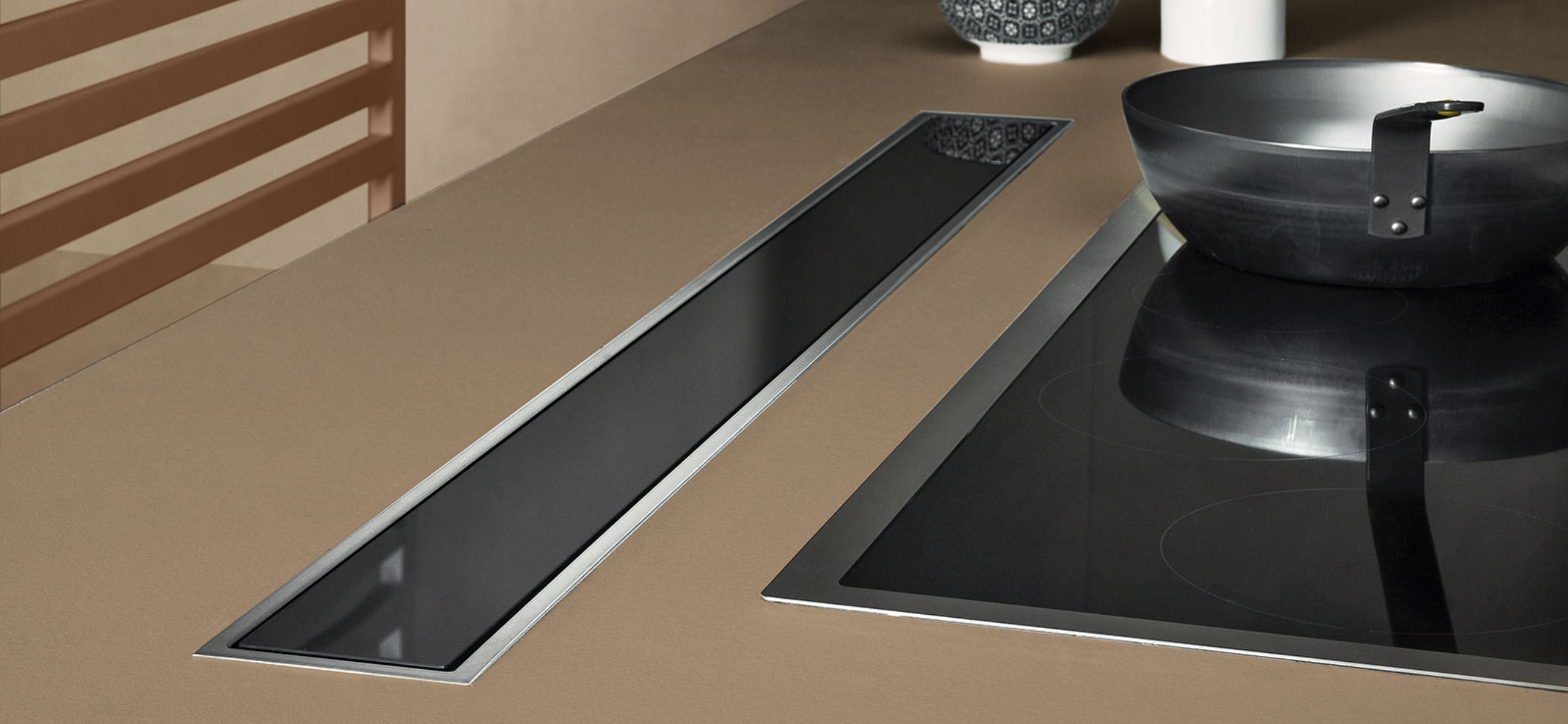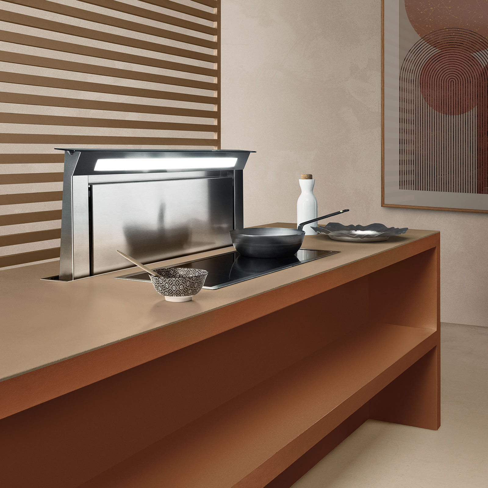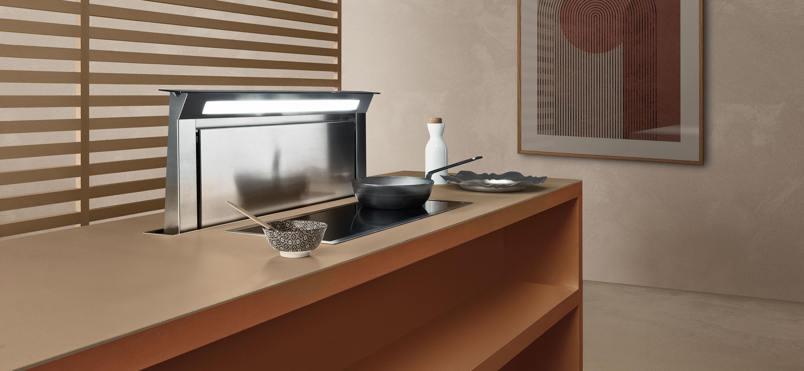 A motorised system allows for the hood to be extracted from behind the worktop, capturing fumes and vapour as they are released from the top of the kitchenware. This solution also guarantees correct lighting of the cooking area, high suction performance and, thanks to various options regarding motors and installation types, optimal use of space inside the counter.